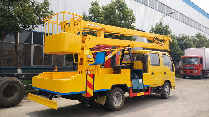 慶鈴五十鈴12米14米16米高空作業(yè)車采用折疊式曲臂結(jié)構(gòu),作業(yè)臂12米為兩節(jié)折疊式14米16米為三節(jié)折臂,工作斗和轉(zhuǎn)臺雙工作位,上下操作,液壓手動控制,可360度回轉(zhuǎn),四液壓支腿,帶1噸吊鉤,工作斗大承重200公斤,鋼制工具箱及圍板、花紋防滑走臺板。